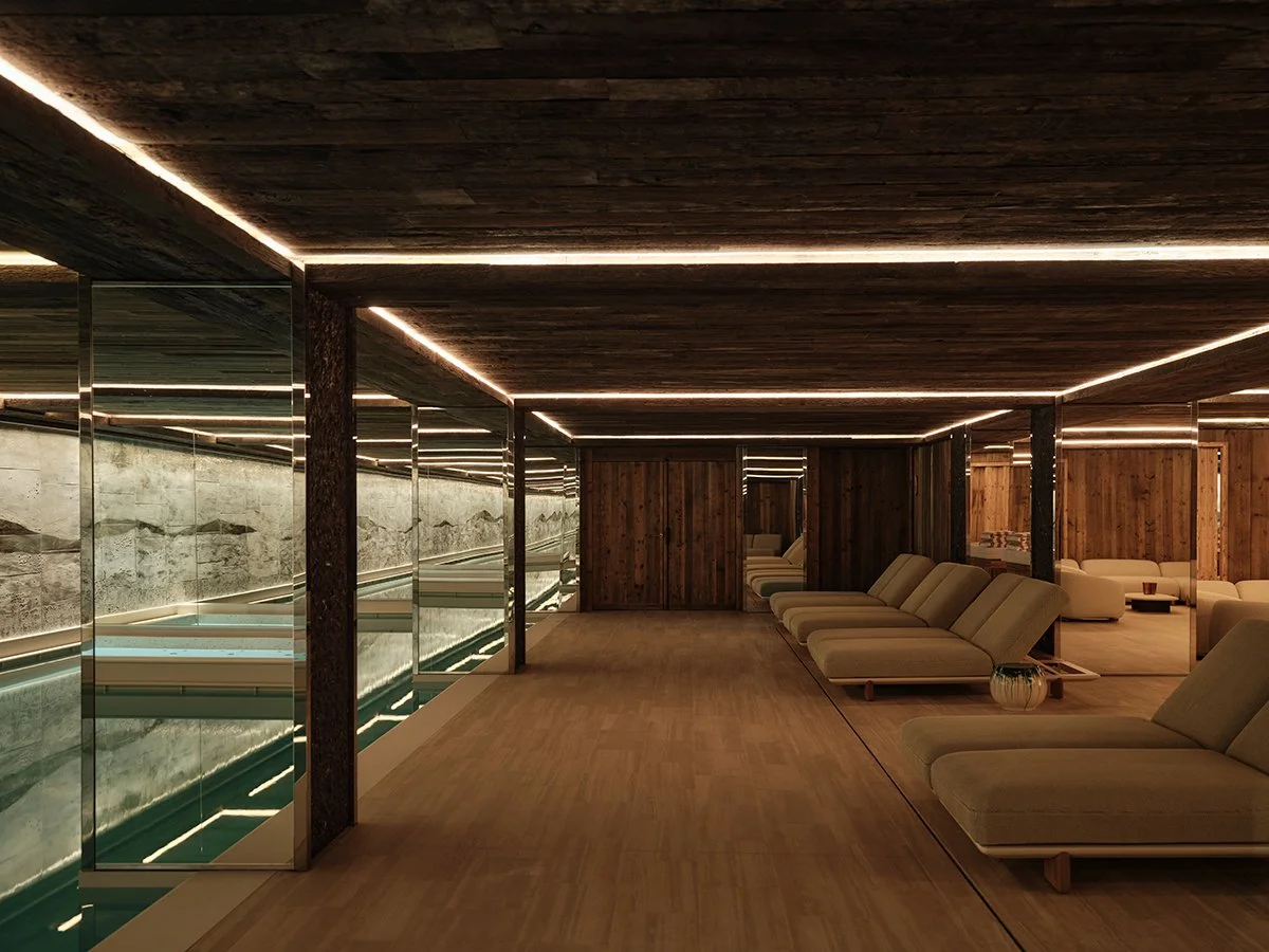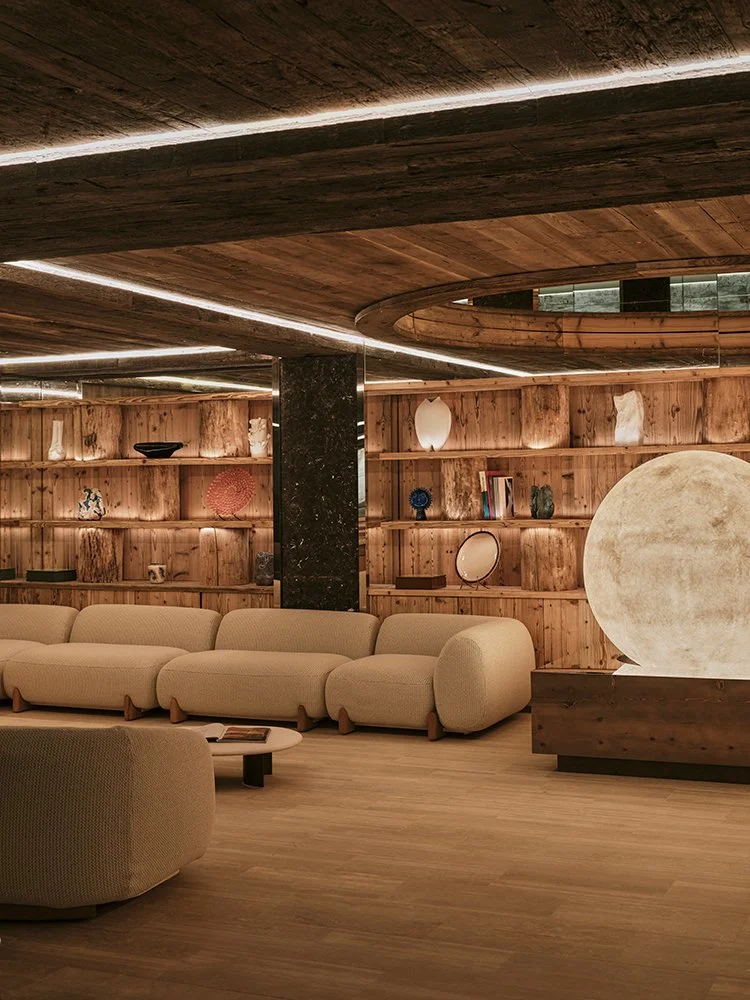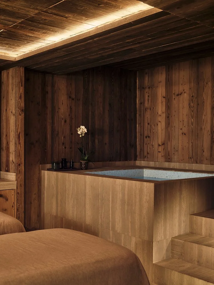 Set within a contemporary mountain chalet, Asaya is the property's transformative integrative wellness concept. The wellness sanctuary was crafted by designer Tristan Auer, mixing sculptural woodwork, natural stone, and playful copper accents.