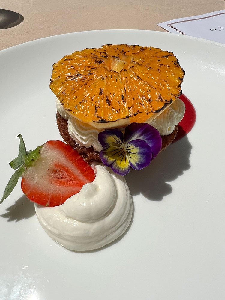 “Hawks Feather” Olive Oil Cake with Meyer Lemon Buttercream, Berry Coulis, and Charred Citrus.