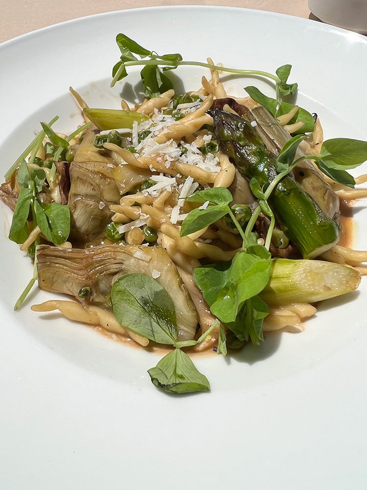 Spring Trofie Pasta with Asparagus, Artichoke, Shiitake, Petit Pois, Marsala Cream Sauce, Pea Sprouts, Grand Padano.