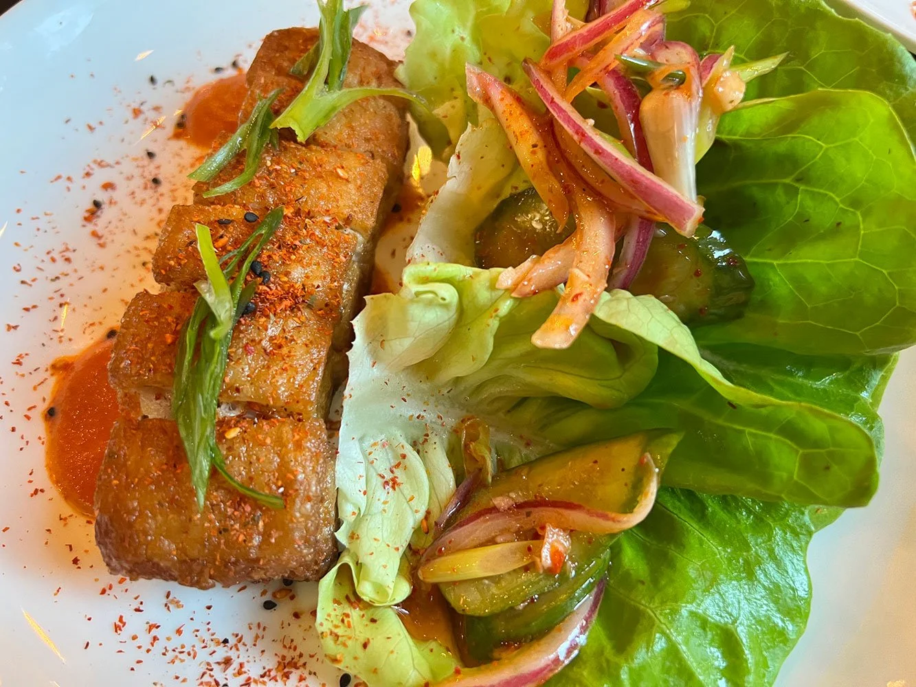 After that we enjoyed the Crispy Soju Braised Pork Belly with Gochujang Sauce, Kimchi Cucumbers, and Artisan Lettuce.