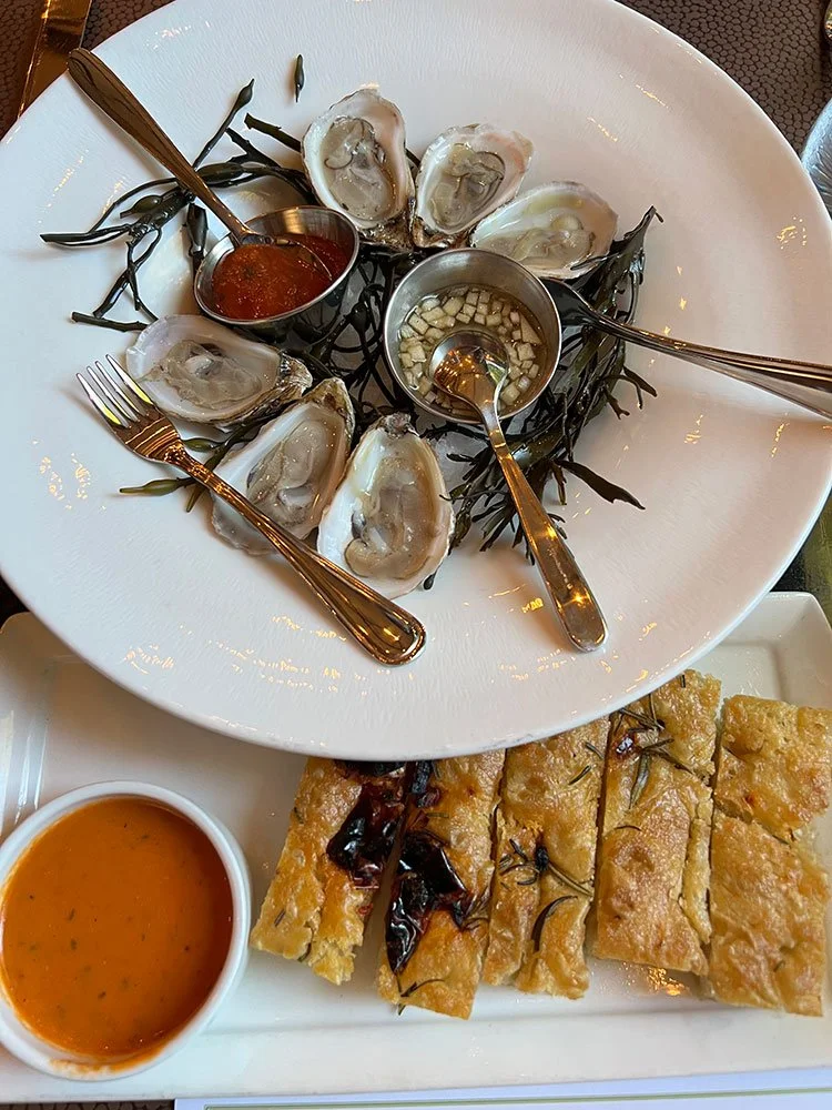 Housemade Focacia with Roasted Red Pepper Italian Dressing and Fresh Pacific Oysters with Apple Cider Mignonett & Tom Cat Gin Cocktail Sauce.