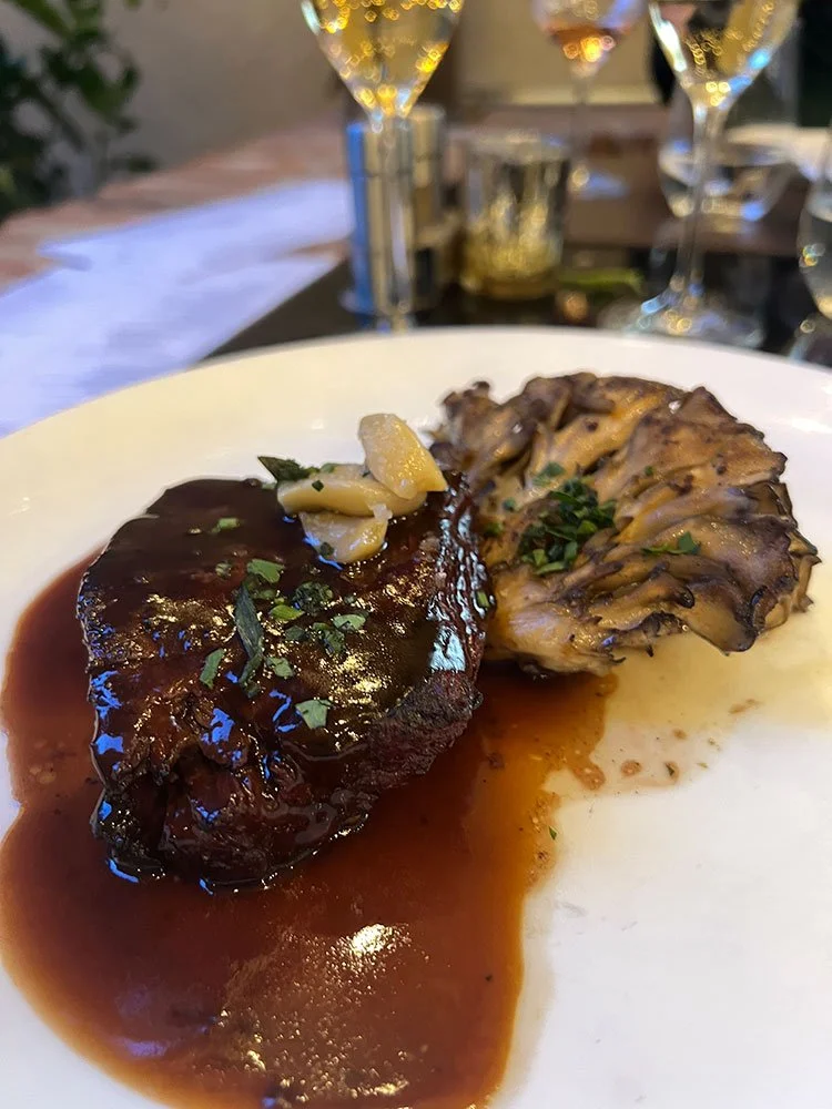 Grilled Cut 7oz Akaushi Bavette with Garlic Confit, Roasted Maitake, and Port Reduction.