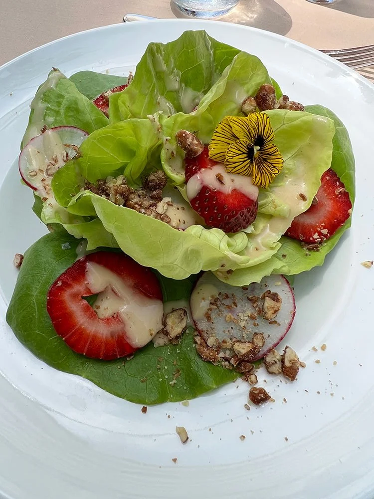 Strawberry Bibb Salad with Napa Pecans, Shaved Radishes, Chives, and Housemade Champagne Vinaigrette.