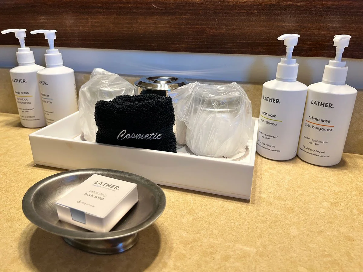 Bathrooms at the Harvest Inn are stocked with Lather products.