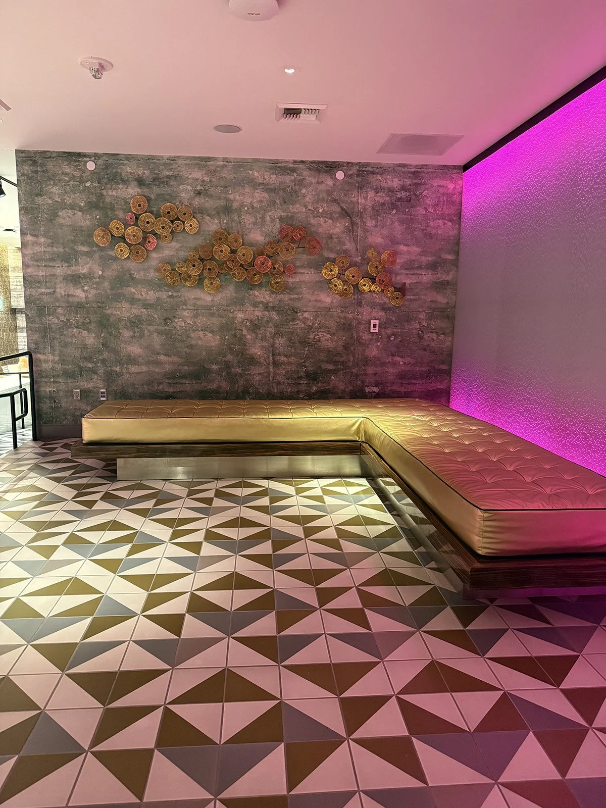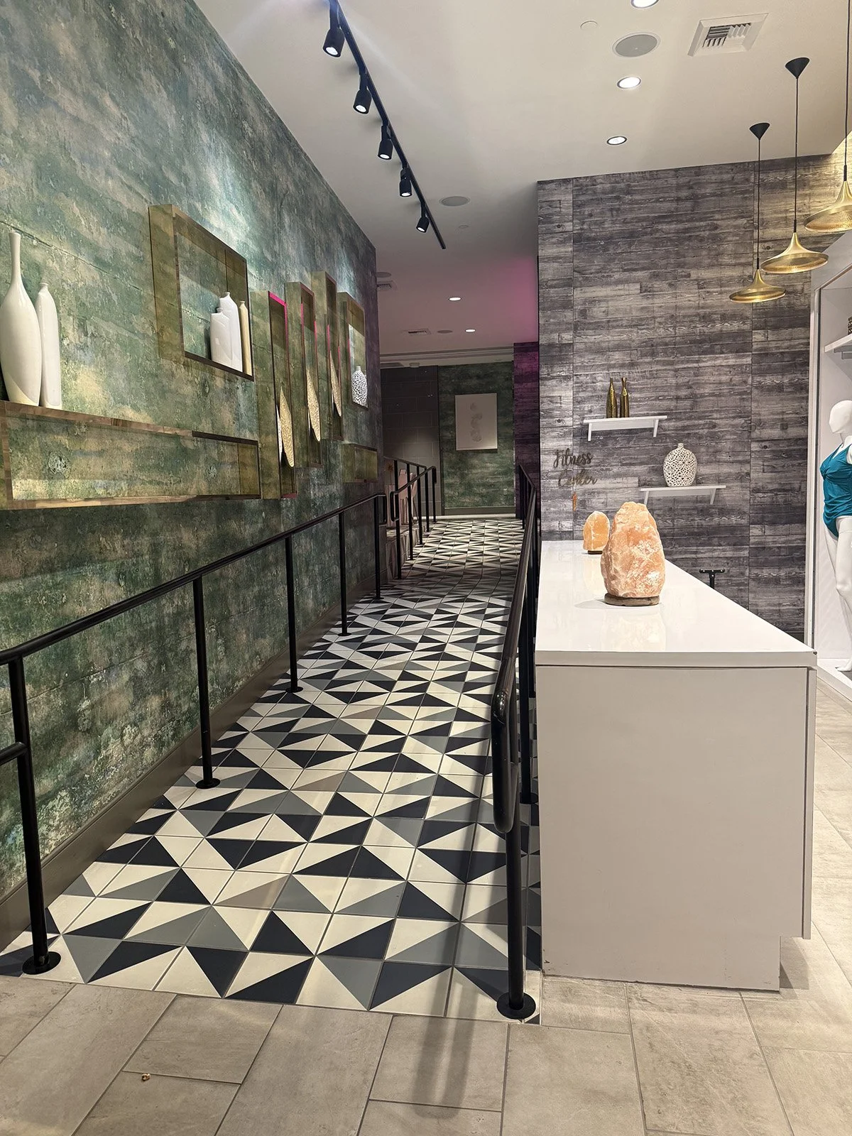 The pathway to reception is outfitted with geometric-patterned tiles in shades of white, charcoal gray, and black, while the walls are awash in deep teal paint that echoes the look of crashing waves on the shore. The overall vibe emits an air of calming tranquility.