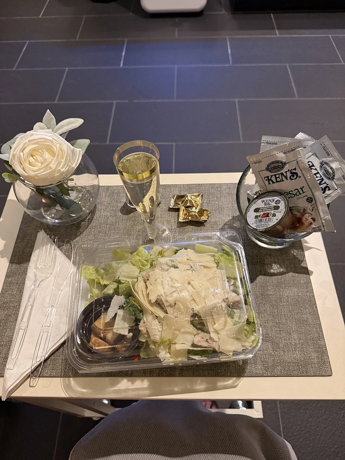After my massage, I was treated to lunch, which is also part of the spa package. I selected the Chicken Caesar Salad, and it was waiting for me on a tray in the lounge along with a small glass of champagne — such a lovely touch!