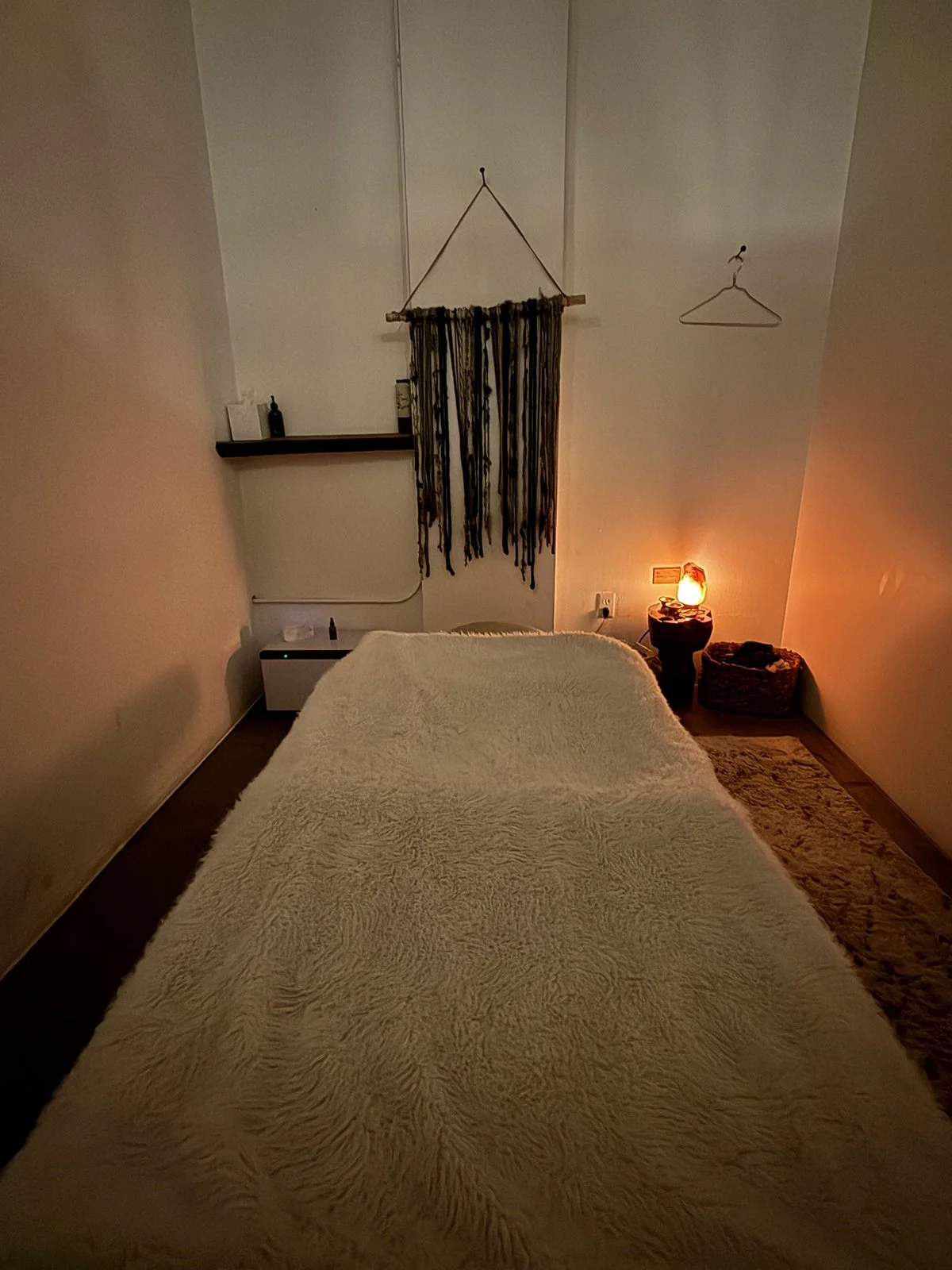 The treatment room is instantly soothing. It’s low lit, featuring a salt lamp on a small table in one corner. The massage bed is dressed in a plush faux fur throw and sleek white sheets. There are baskets and small holders for your clothing and jewelry, and light brown wall hangings placed around the room.