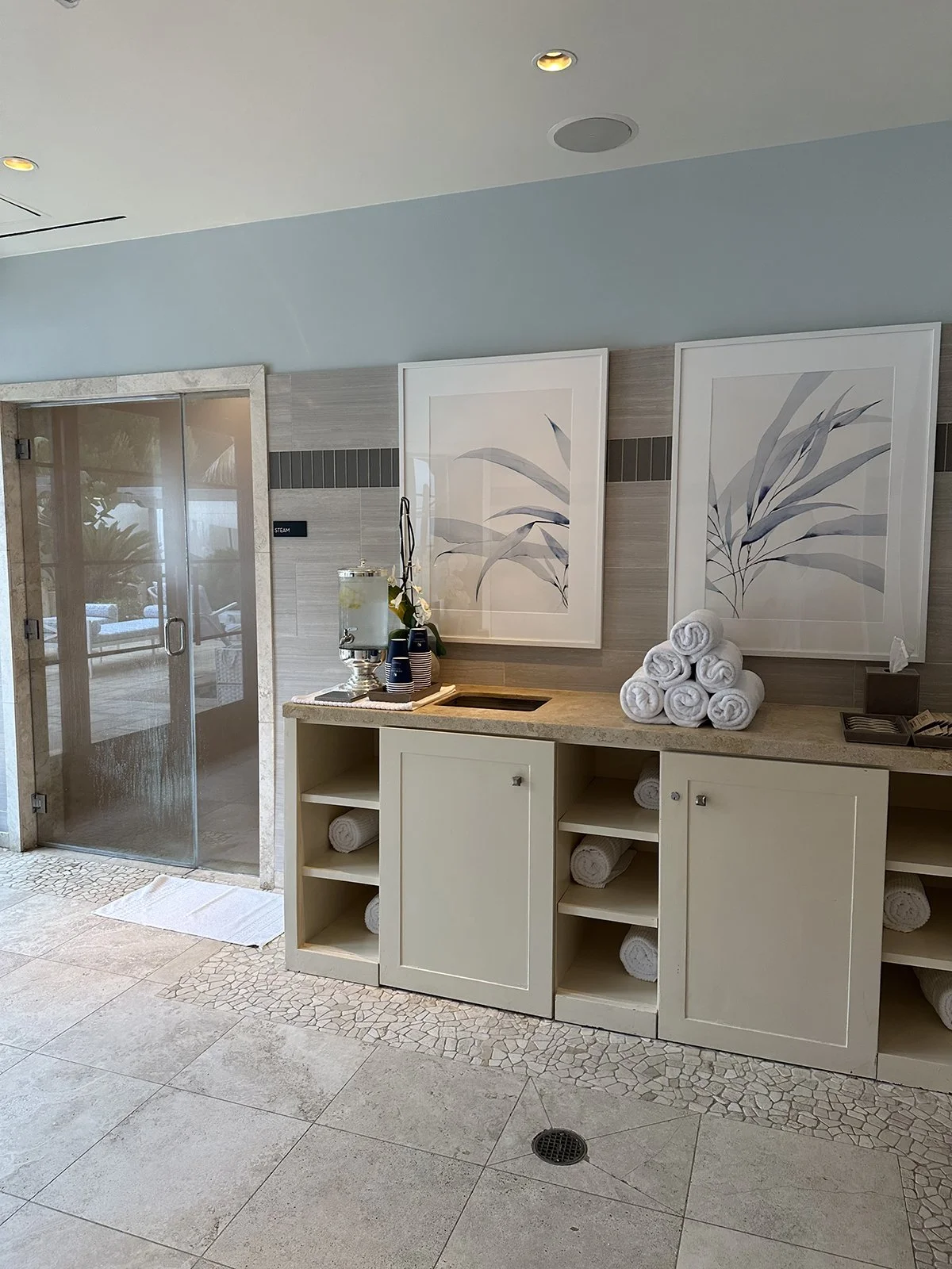 The spacious locker room/changing area and bathrooms had a tranquil coastal aesthetic with shades of soft blue and sandy neutral.