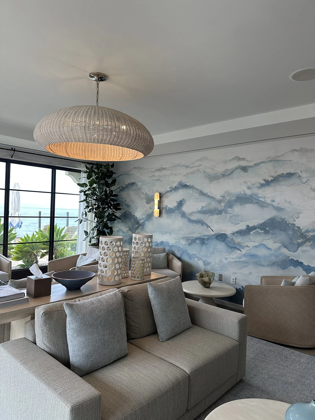 The walls featured a blue-and-white color-splashed mural wall covering that reminded me of the calming ocean waves, and was complemented by coastal-inspired lighting, artwork and other design details.
