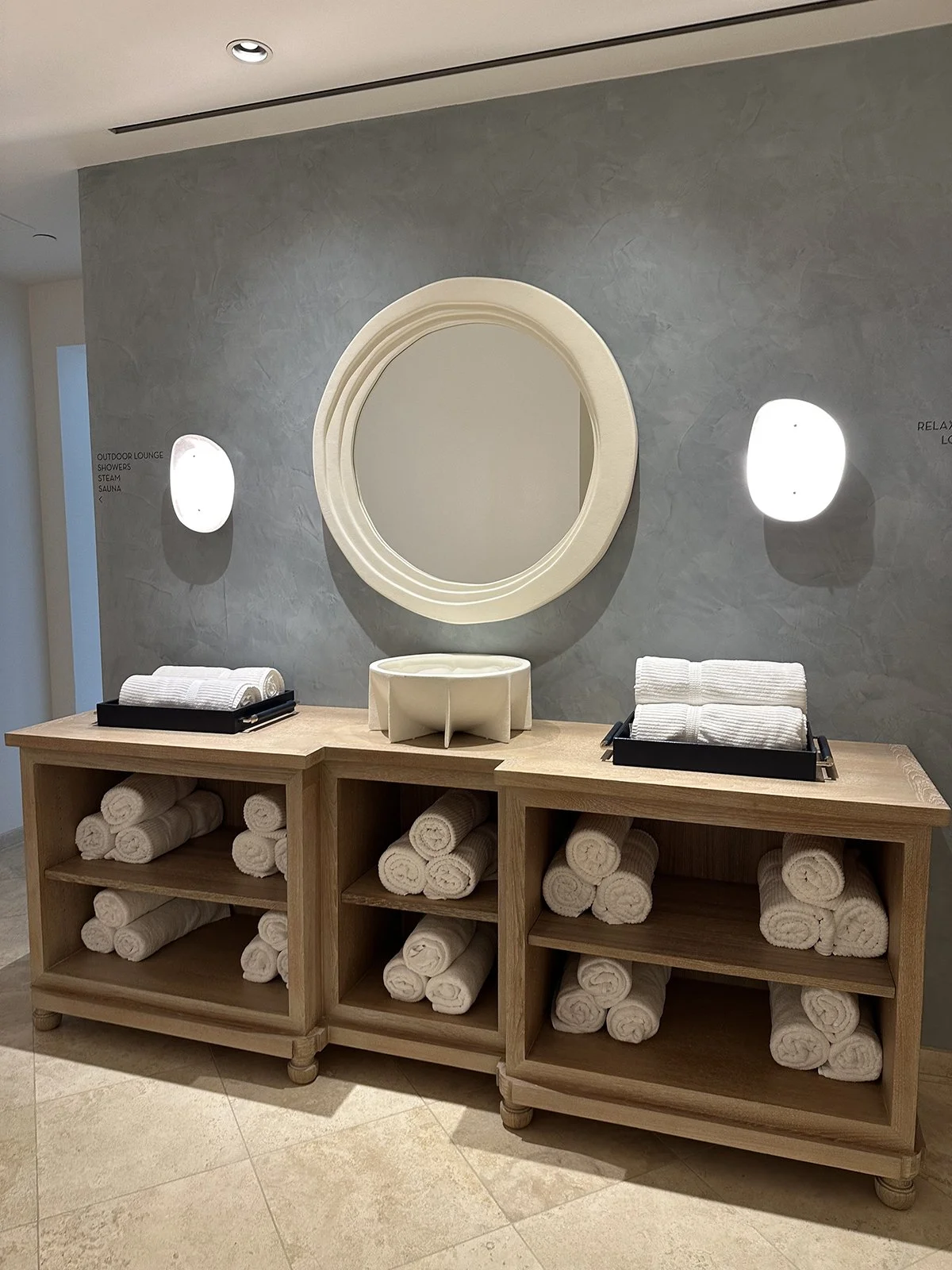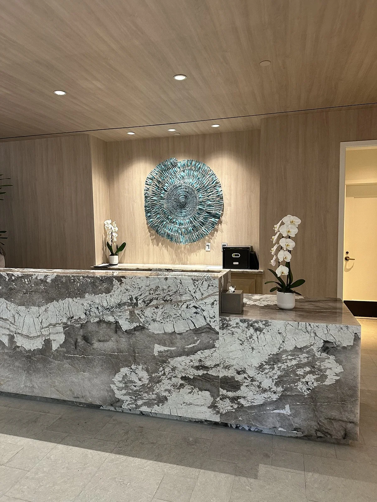 The first thing that caught my eye when I entered the spa’s lobby and reception area was the new reception desk, which is made from beautiful monolithic quartzite and had a stunning decorative artwork hanging on the wall behind it.