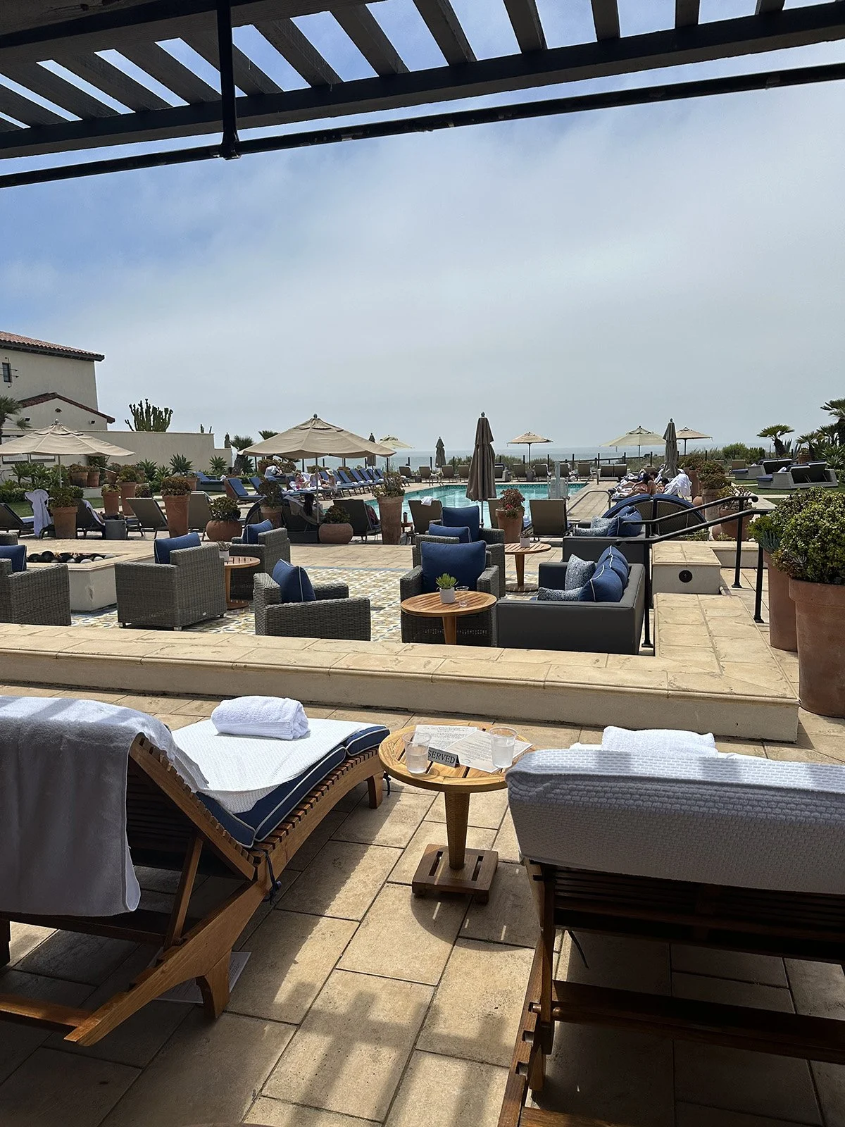 During our time at The Spa at Terranea, we spent half the day relaxing in a cabana, which truly elevated our poolside experience. The spacious cabana included a covered sitting area with a table where we could take a break from the sun. It was a great place for stashing belongings that needed to be kept out of the heat including cell phones and other personal belongings. We enjoyed views of the pool and the ocean from our cabana, which made for a relaxing afternoon.