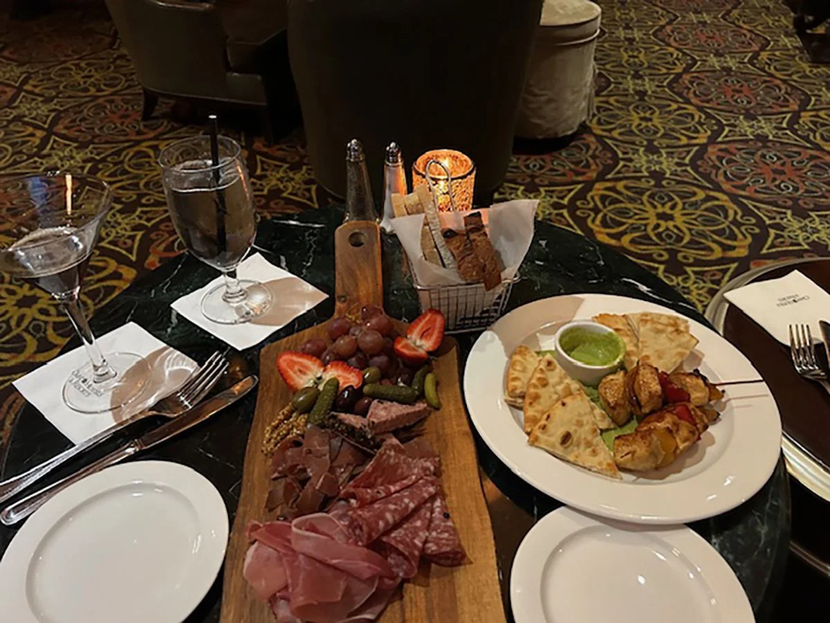 The charcuterie board and chicken kebobs at the Marquee Lounge.