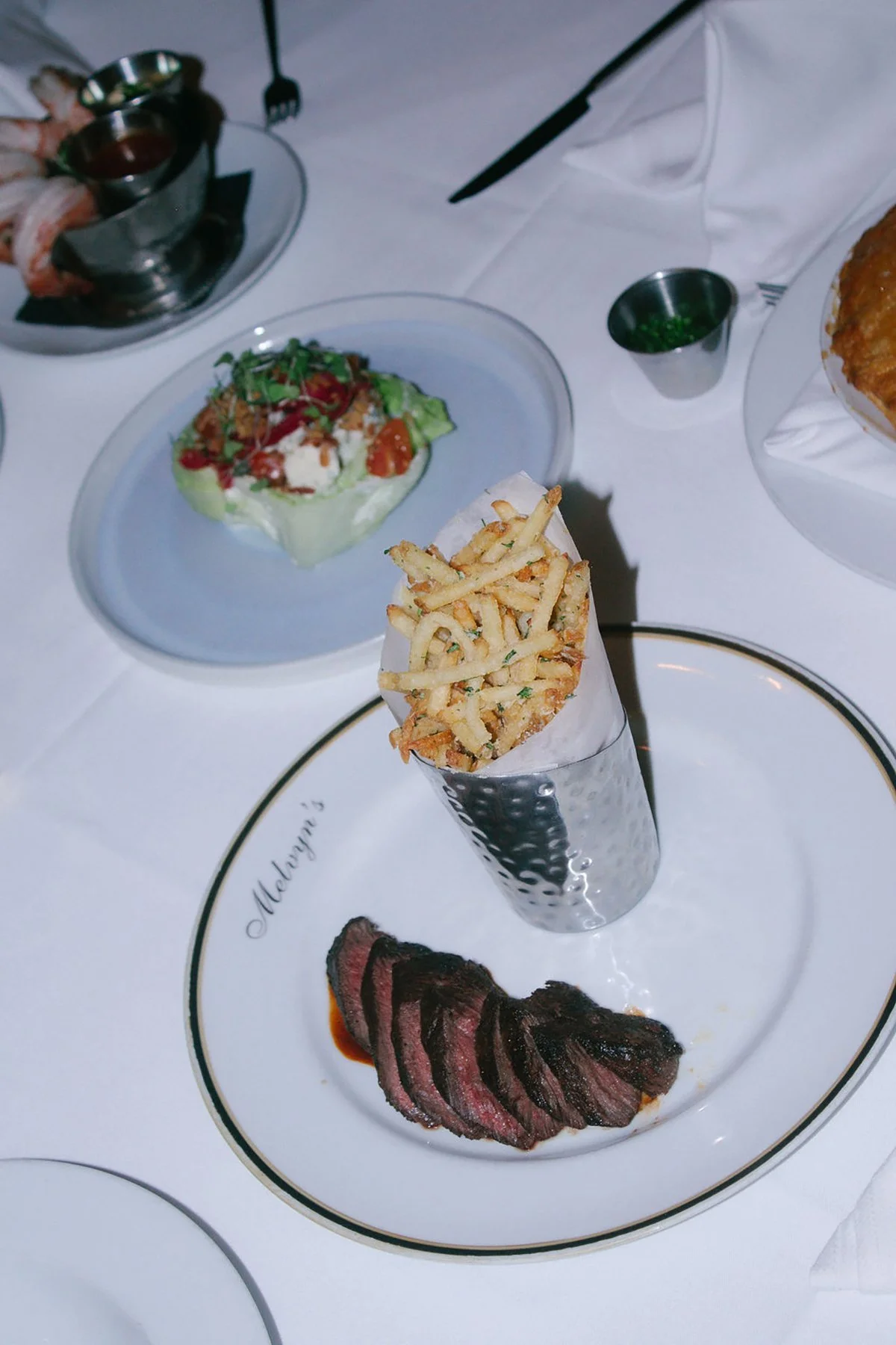 Relive the glamour of Melvyn’s early years with French Onion Soup crowned with bubbling gruyère, classic Steak Diane, and indulgent Bananas Melvyn flambéed table-side.