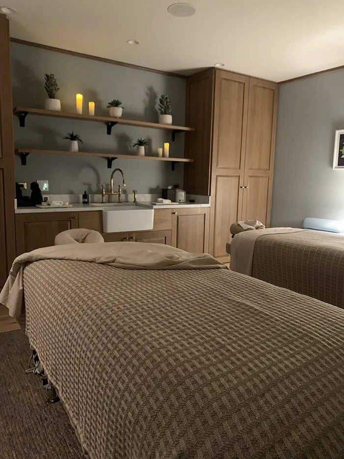 In front of the massage tables was an accessible farmhouse sink, floating shelves with minimalistic decor, and white oak cabinets. The tables were comfortably lined with soft linens and heated to the perfect temperature. I was also able to choose the scent of the body soufflé used for my treatment. Lavender eucalyptus it is!
