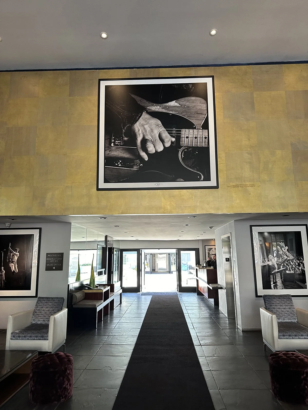 Walking through the breezeway that leads to the rest of the property, I came across more amazing photographs of Madonna, Nirvana, Bob Dylan, John Bon Jovi, and others that were on the walls. There was a comfortable open-air sitting area and a larger-than-life guitar covered in photos with the street signs for Alta Loma Road and Sunset Boulevard at the top, which is where the hotel is located.