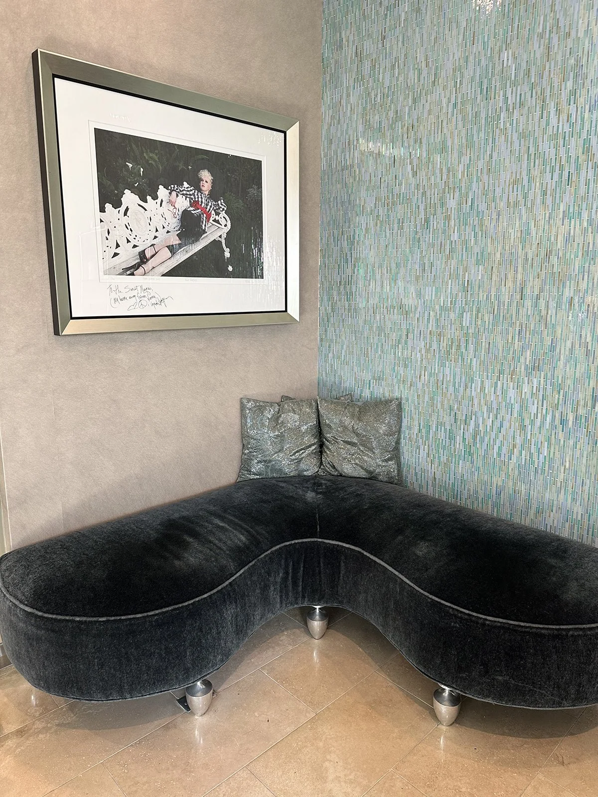 The spa’s waiting area features comfortable plush seating under a signed photo of Cyndi Lauper.