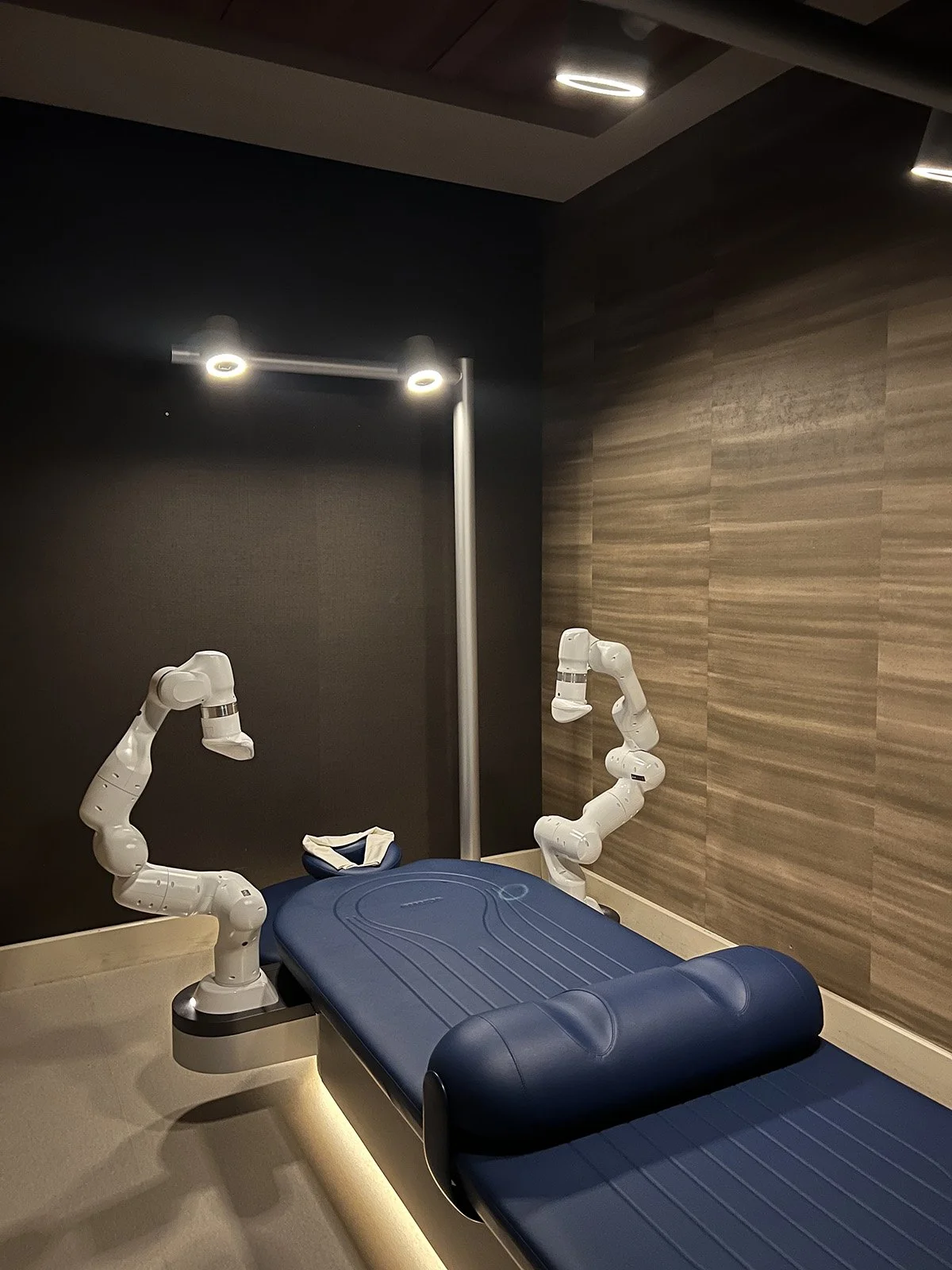 After changing into a skintight tee and pants that resembled a wetsuit, I was led to my Aescape massage room. Inside, I found the Aescape massage table, which is offset by two large white robotic arms.
