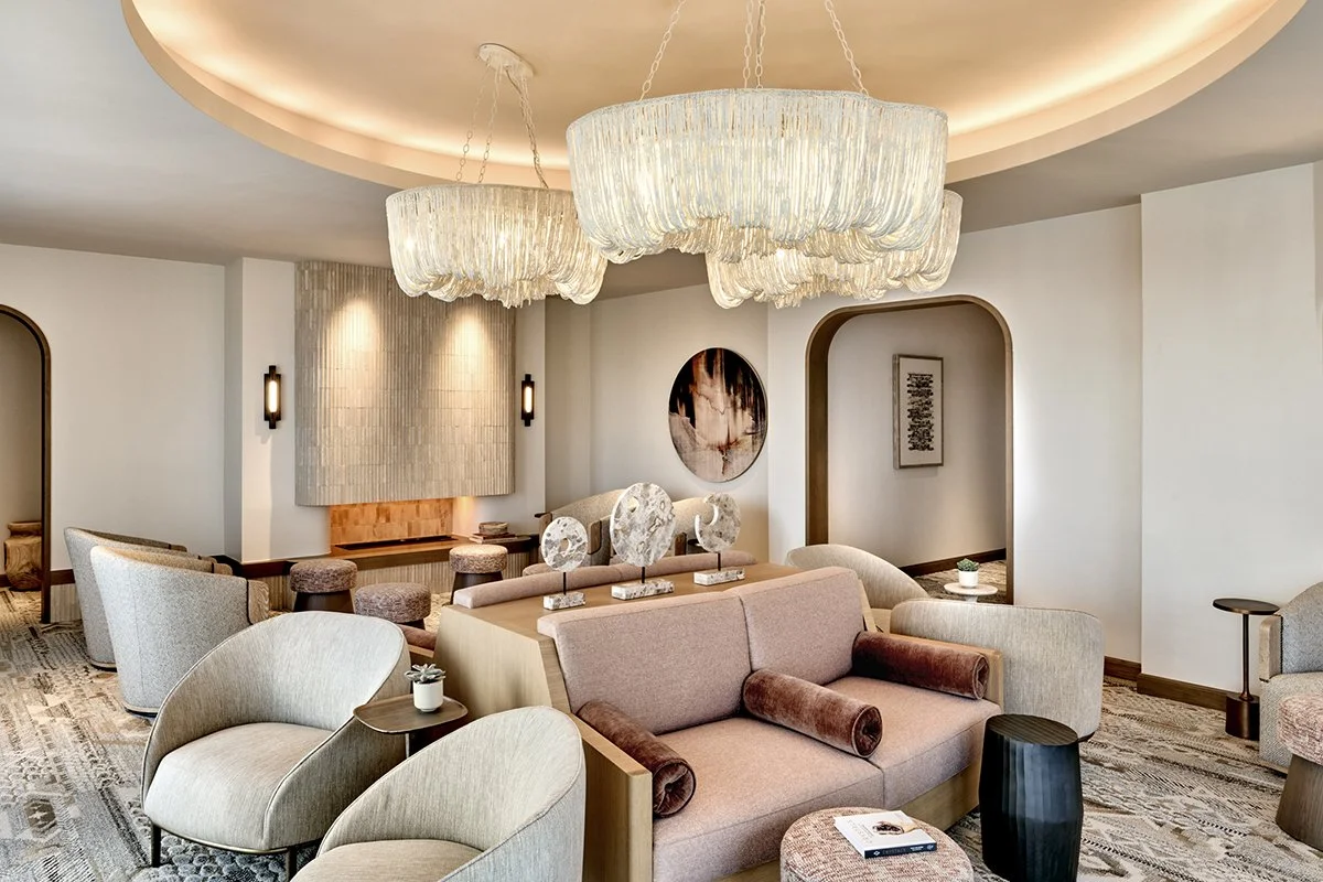 The second is a lighting installation that seamlessly reinforced the spa’s connection to nature — a set of striking S-shaped chandeliers crafted from natural agave fiber that seem to drape overhead, as if you’re beneath an ethereal spa tree.