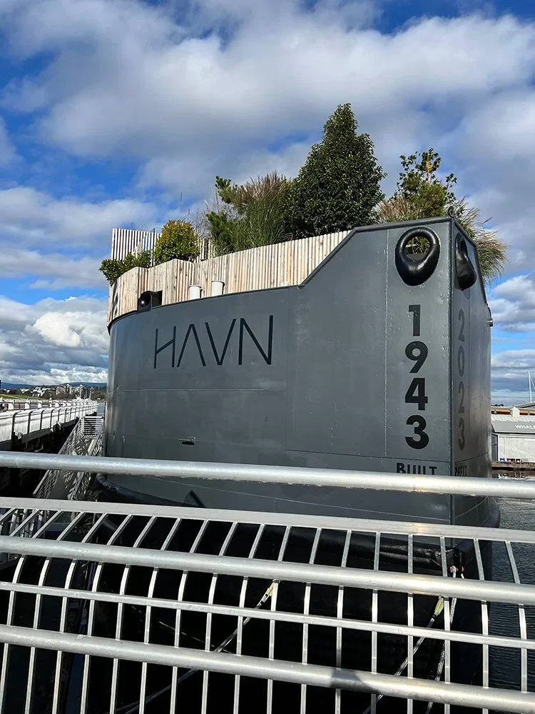 The hydrotherapy circuit at HAVN is a one-of-a-kind floating spa built on a repurposed barge that was once docked at Pearl Harbor. The top level of the barge features a lush green setting filled with cold plunges, hot tubs, and saunas – all with extraordinary views of Victoria Inner Harbour.
